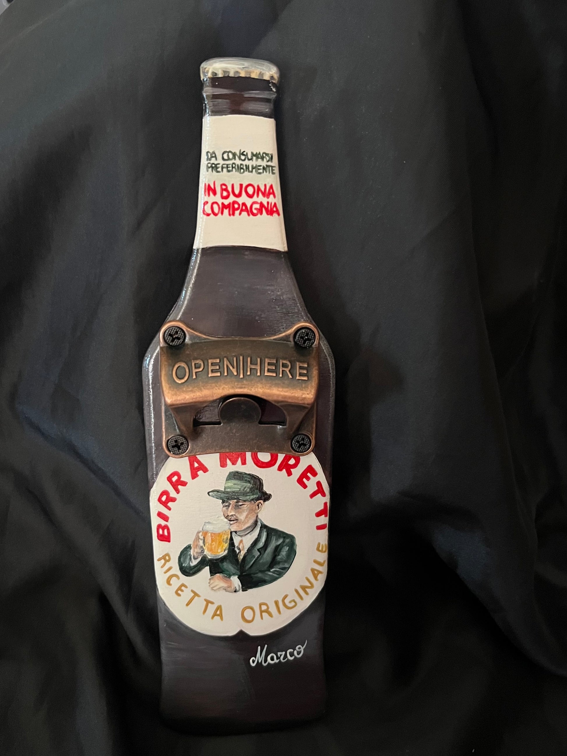 Un apribottiglie originale .Un lavoro artigianale scrupoloso per riprodurre la bottiglia preferita del papà a cui era rivolto il regalo.
