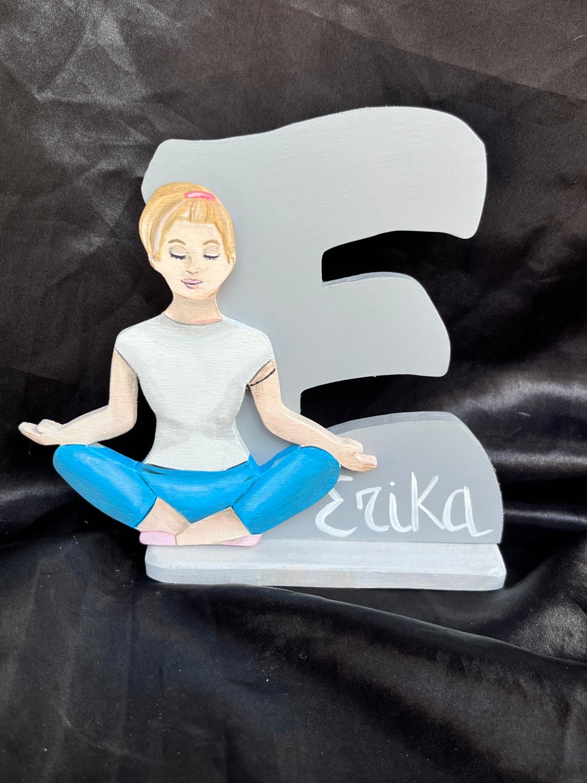 Lettera in legno personalizzata con il nome e una sagoma con le caratteristiche della persona a cui è dedicata e del suo lavoro