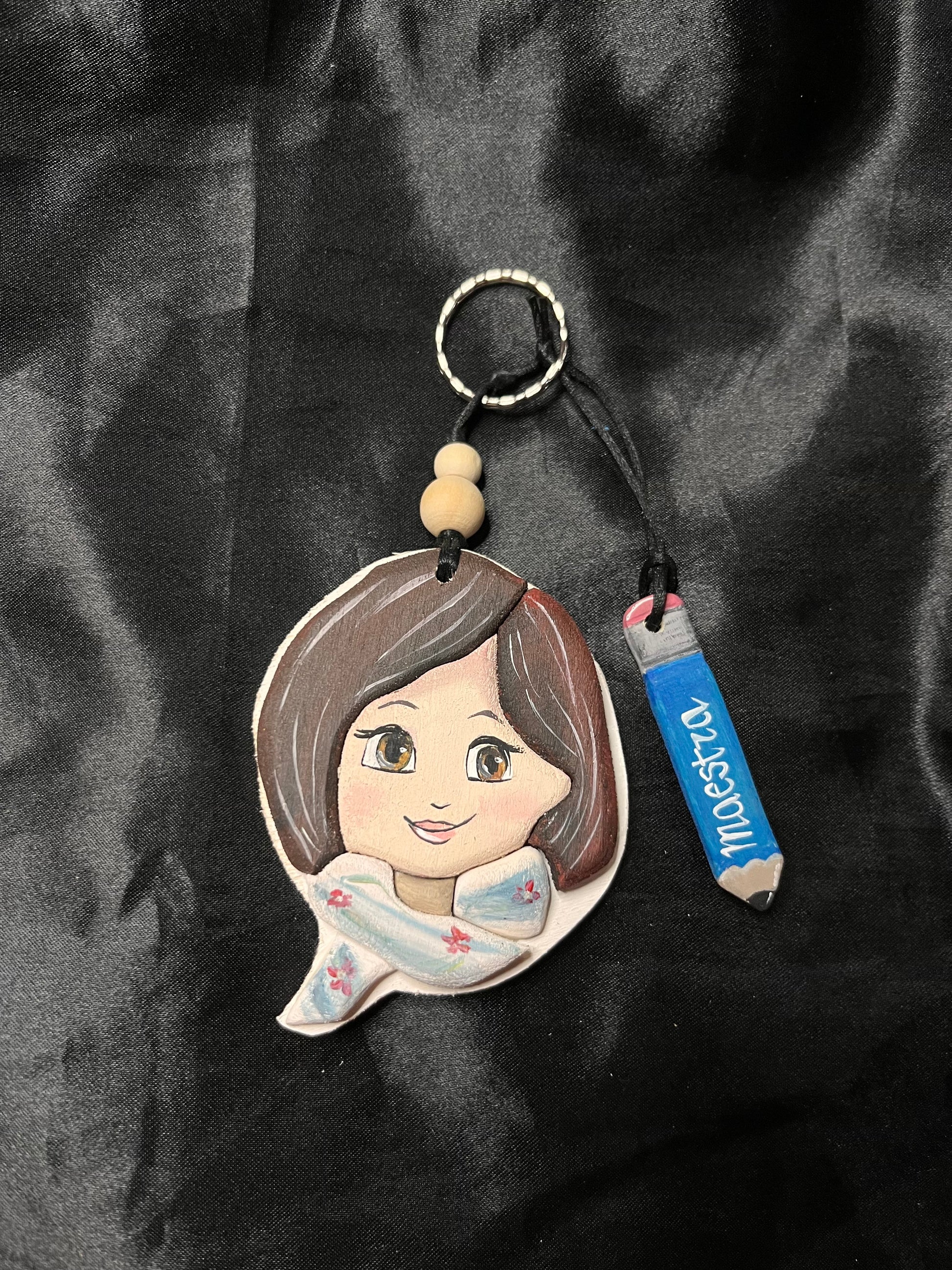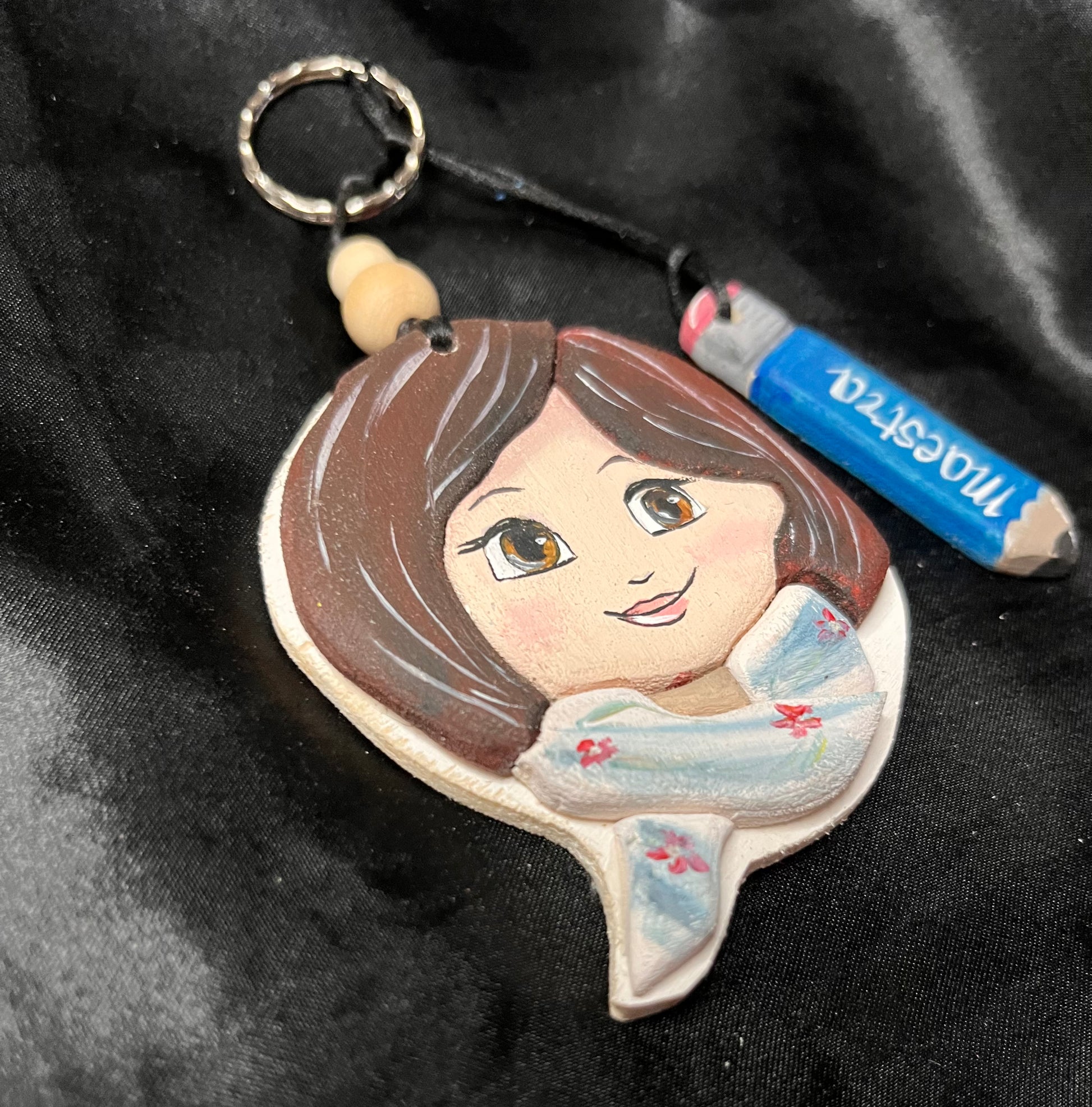 Portachiavi in legno personalizzabile con il volto della maestra in stile cartoon, perfetto per regalare un tocco di originalità e affetto! Realizzato in legno questo portachiavi è un'idea unica e simpatica per celebrare la figura della maestra. Il design a cartoon cattura l'essenza del suo volto in modo divertente e carino, rendendolo un oggetto pratico ma anche molto speciale.