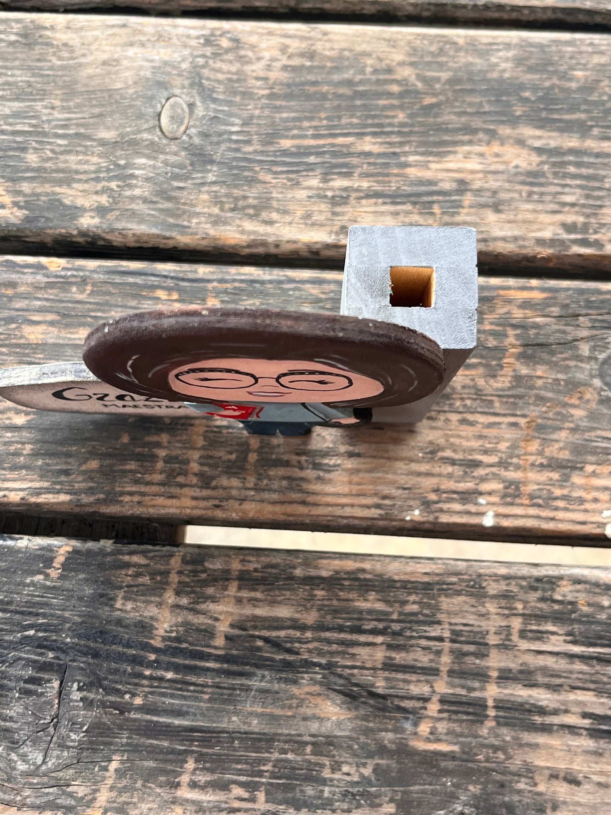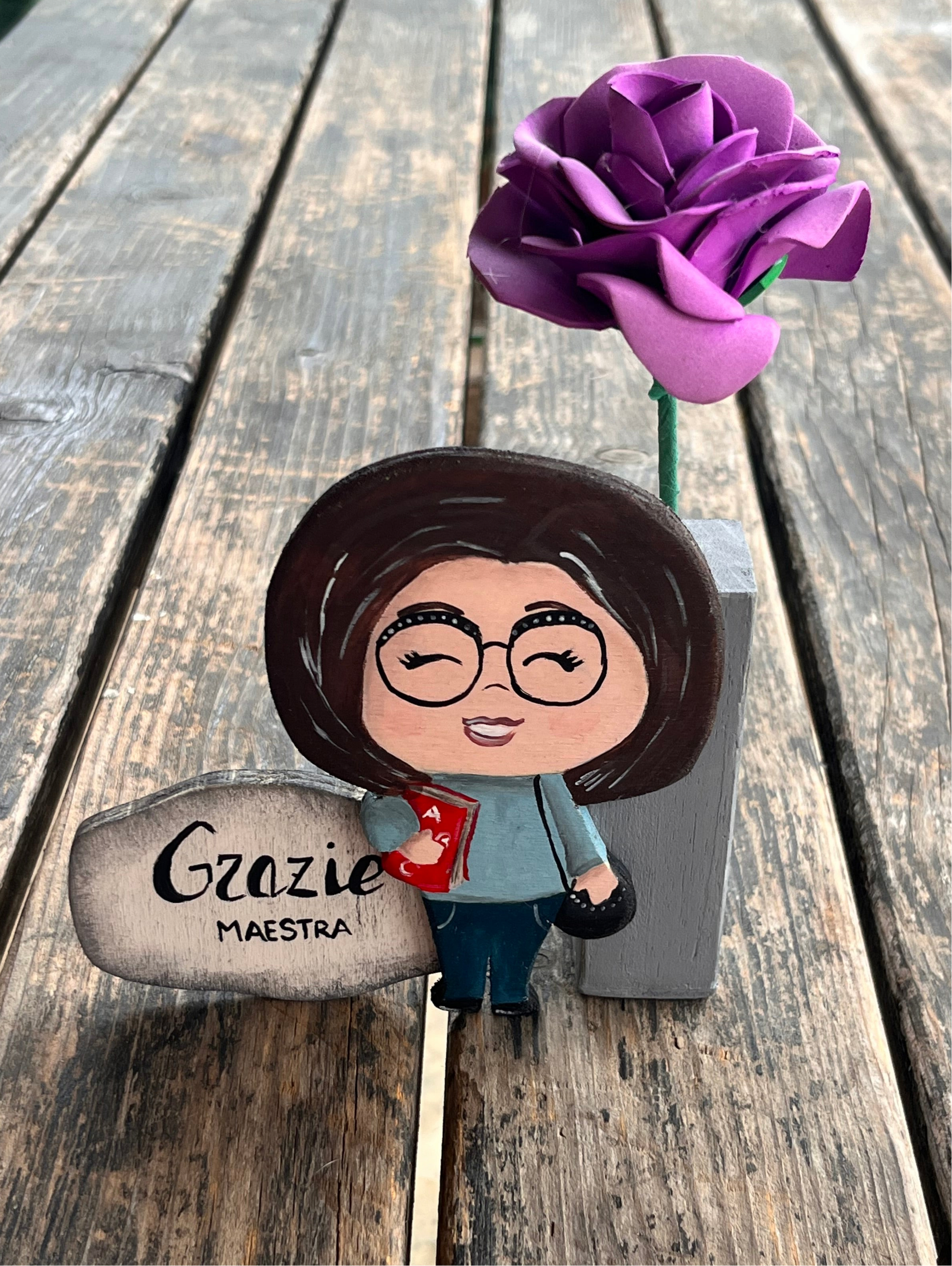 Una sagoma che rappresenta una maestra, pensata come un regalo di fine anno. La figura è stilizzata, con lineamenti morbidi e un sorriso accogliente, che trasmette gentilezza e dedizione. La maestra tiene in mano una lavagna o un libro, simboli del suo ruolo educativo. La sagoma è realizzata in legno con una base stabile che funge da supporto per un piccolo vaso di fiori, creando un perfetto equilibrio tra arte e funzionalità.