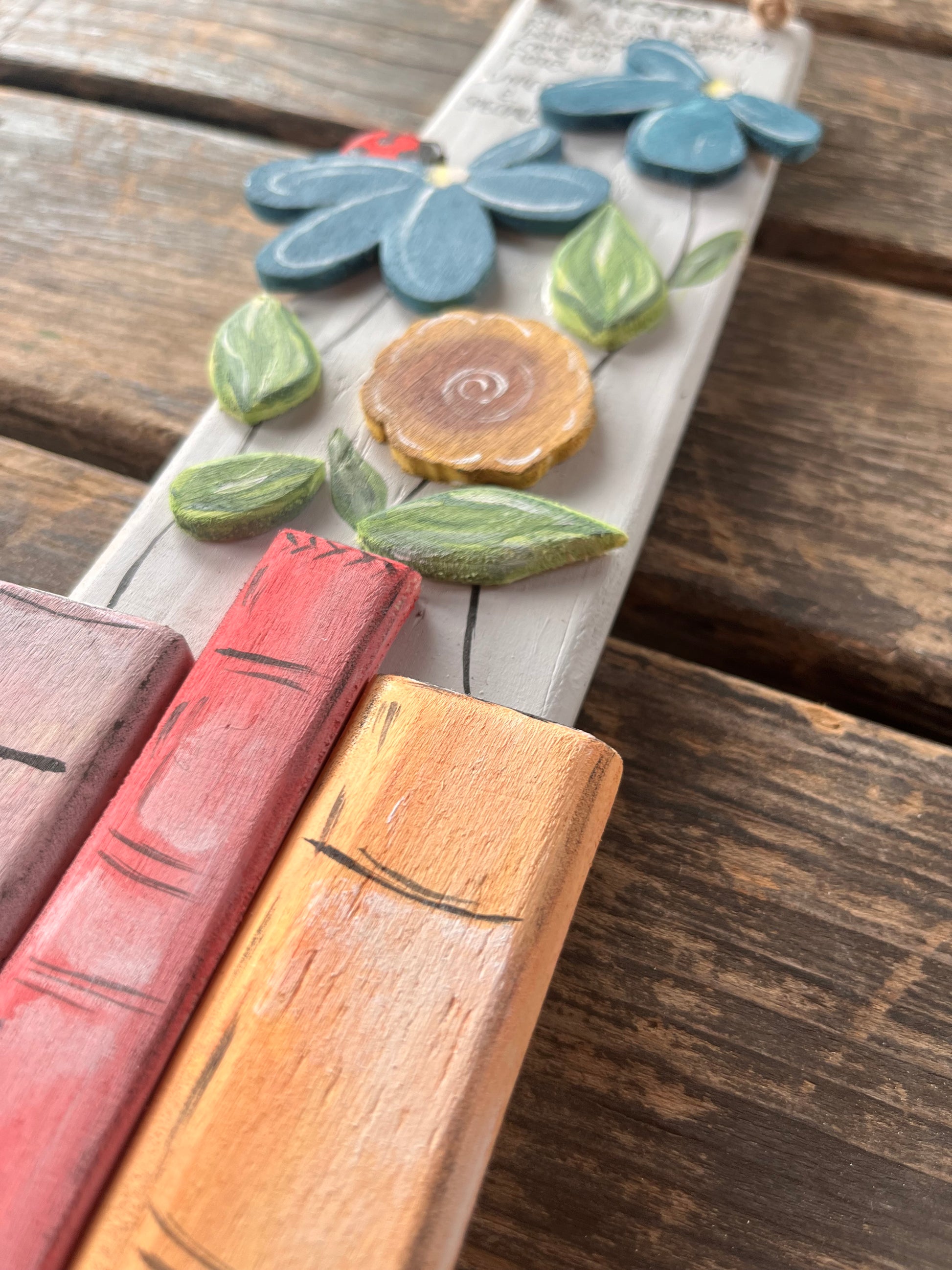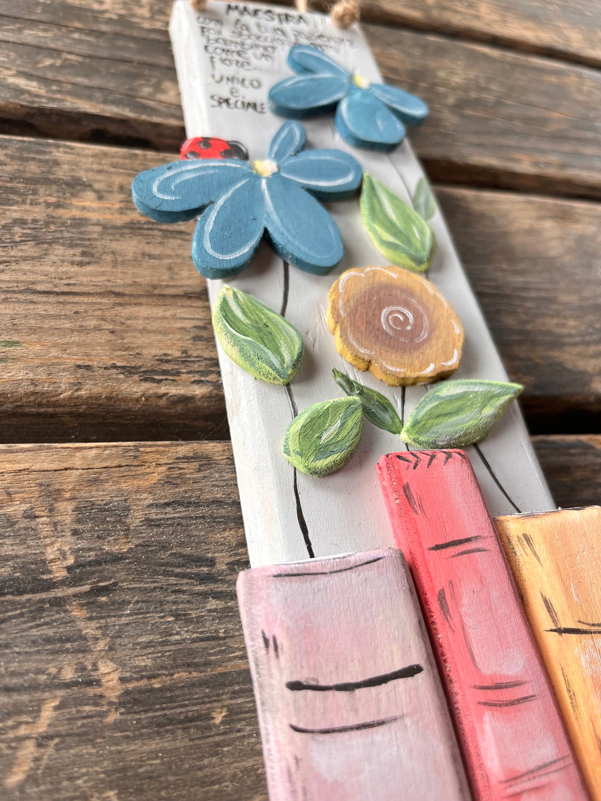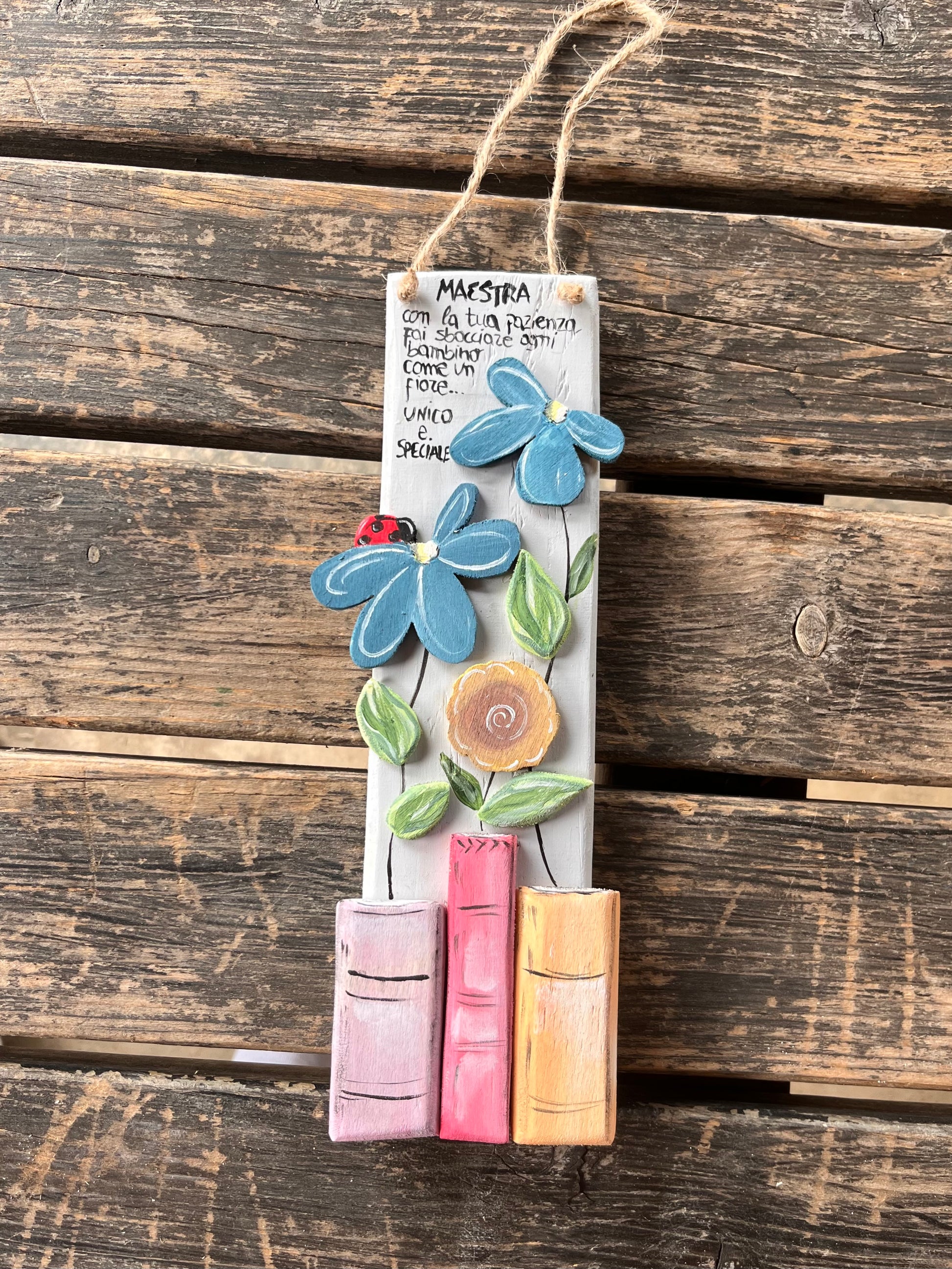 Questa delicata decorazione da parete in legno è un omaggio poetico alla crescita e all’apprendimento. Realizzata artigianalmente, raffigura libri dai quali sbocciano fiori, simbolo dei bambini che, a scuola, crescono e fioriscono attraverso la conoscenza.